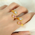 A chic and modern design, the Teardrop Duo Ring brings together two sparkling pear-shaped zircon stones — one in a soft blush pink and the other in a clear crystal tone — set on a sleek open band. The asymmetrical placement of the stones gives this ring a refined yet playful edge, making it a versatile accessory for both everyday wear and special occasions. Its polished gold-tone stainless steel band enhances the brilliance of the stones while ensuring durability and comfort.