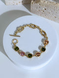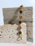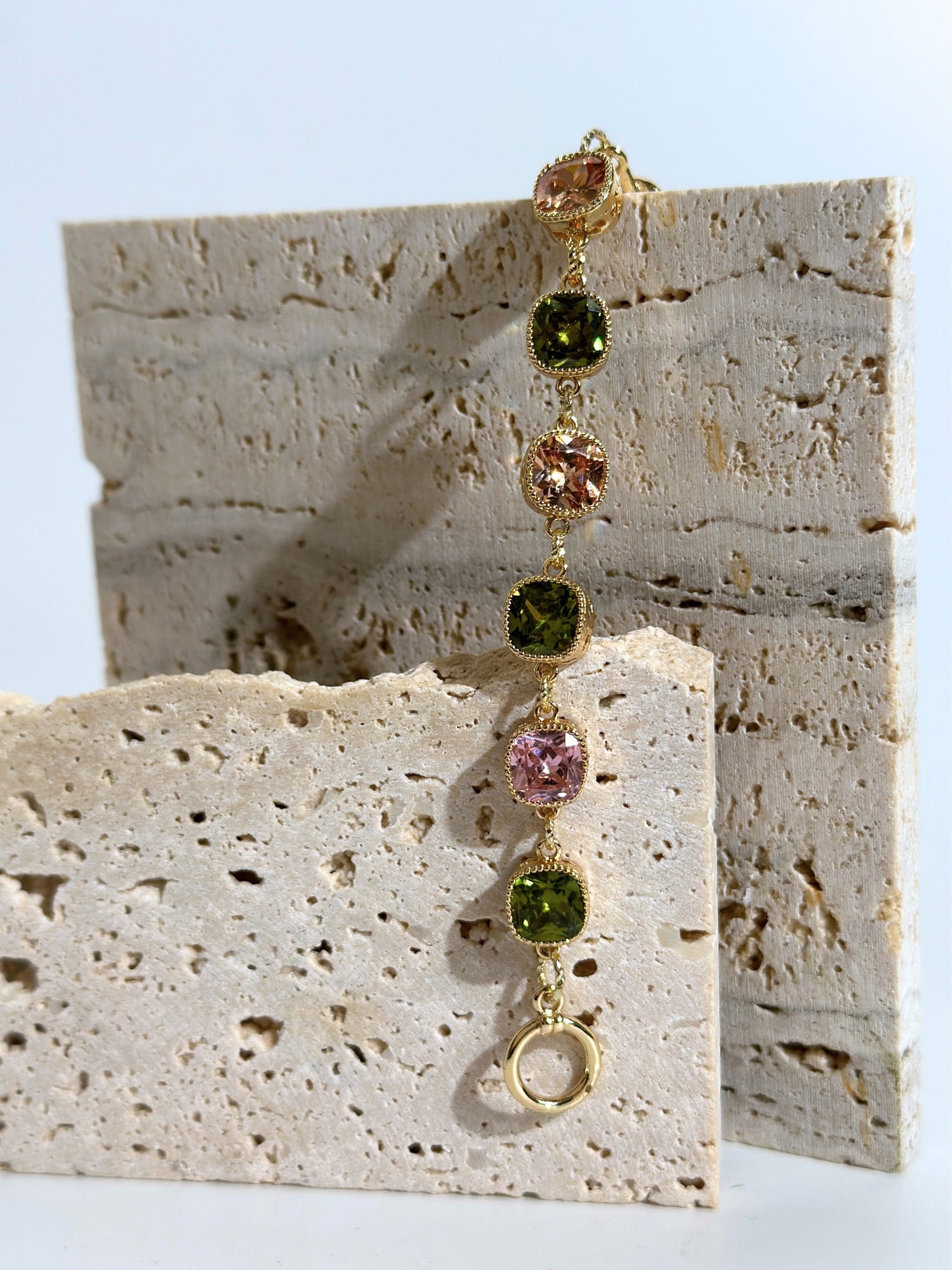 A delicate balance of color and sophistication, the Amara Bracelet shines with soft-toned zircon stones in shades of pink, champagne, and olive green. Each gem is set in a finely detailed gold frame, linked by sculptural chain elements that add a touch of modern artistry. Designed to capture the light with every movement, it embodies effortless grace and quiet luxury.