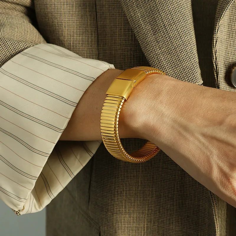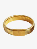 Elevate your everyday style with this sleek and timeless stainless steel cuff bracelet. Designed with a bold, flexible band and a secure clasp, this bracelet embodies strength and elegance in one piece. Available in both polished gold and silver finishes, it’s a versatile accessory that complements both casual and formal looks. Whether worn solo for a refined statement or stacked with other pieces for a modern edge, this bracelet is the perfect addition to your jewelry collection.