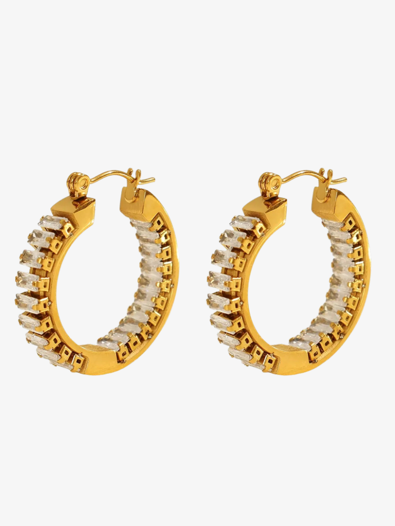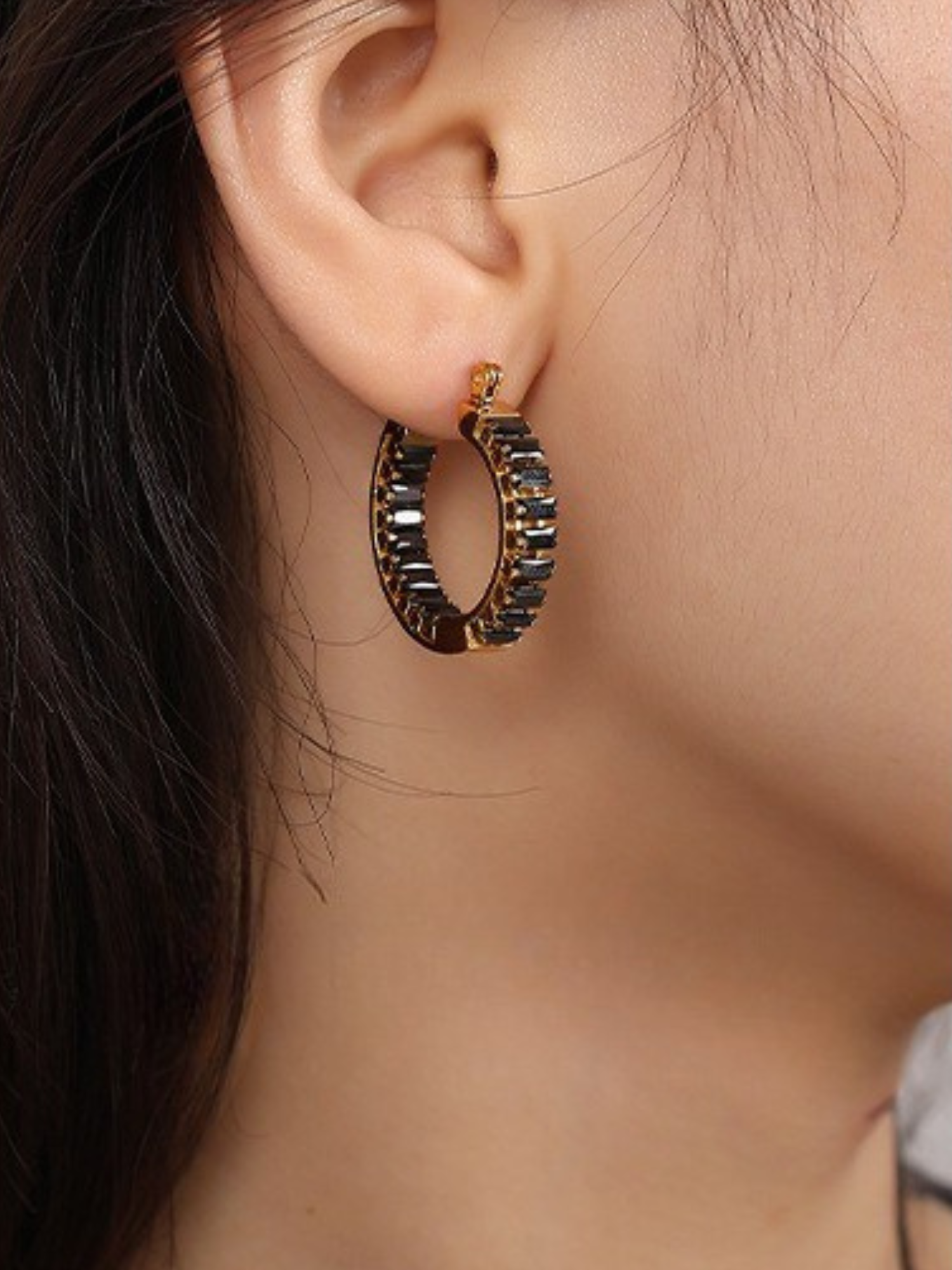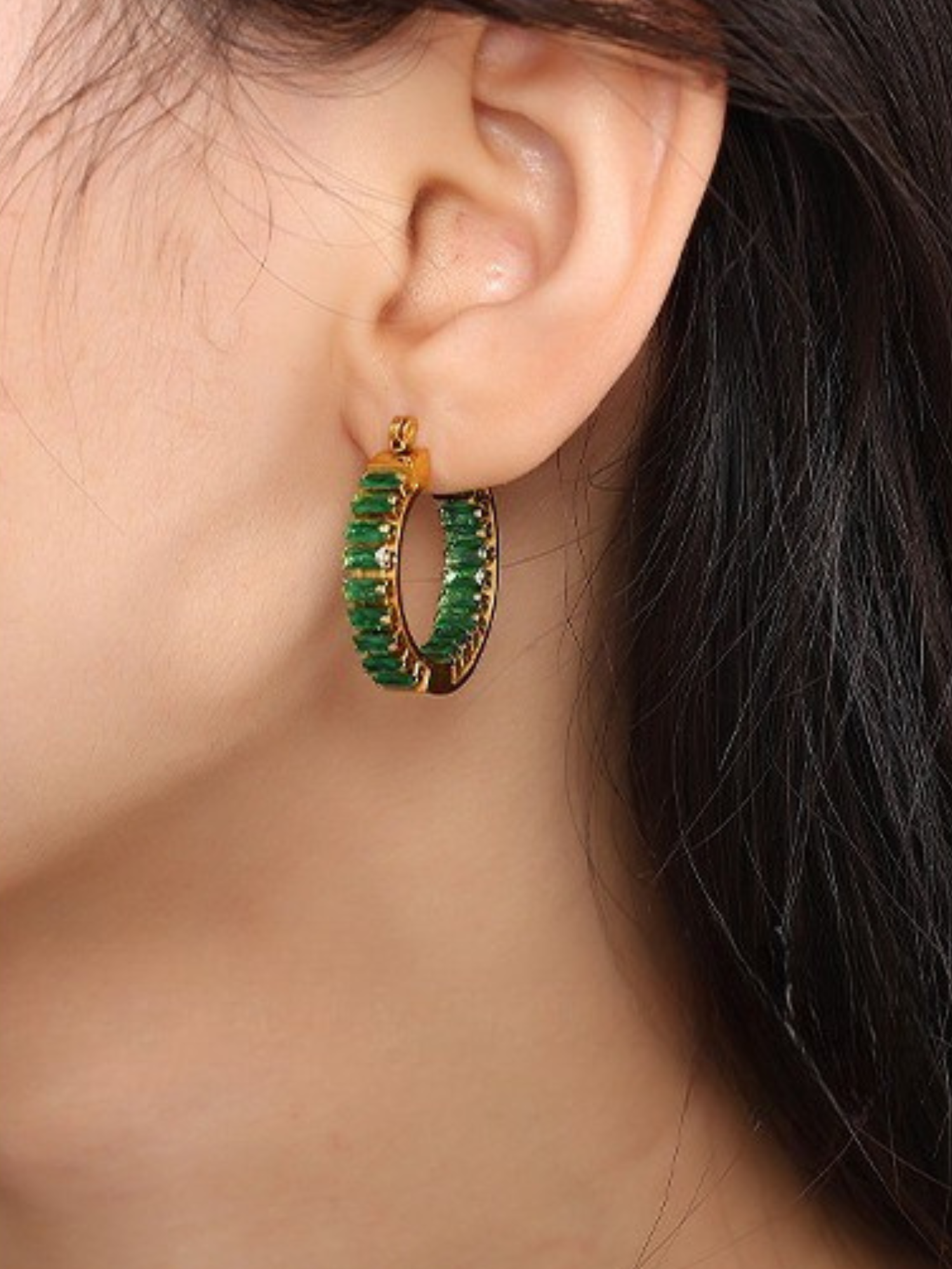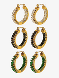 Add a touch of timeless sparkle with these zircon-adorned hoop earrings. Designed with a bold yet refined silhouette, each hoop is set with precision-cut zircon stones in your choice of classic clear, deep black, or vivid emerald green. The lustrous gold-tone stainless steel base enhances their brilliance, making them perfect for both everyday styling and evening occasions. Lightweight yet eye-catching, these hoops will be your new go-to for elevating any outfit.