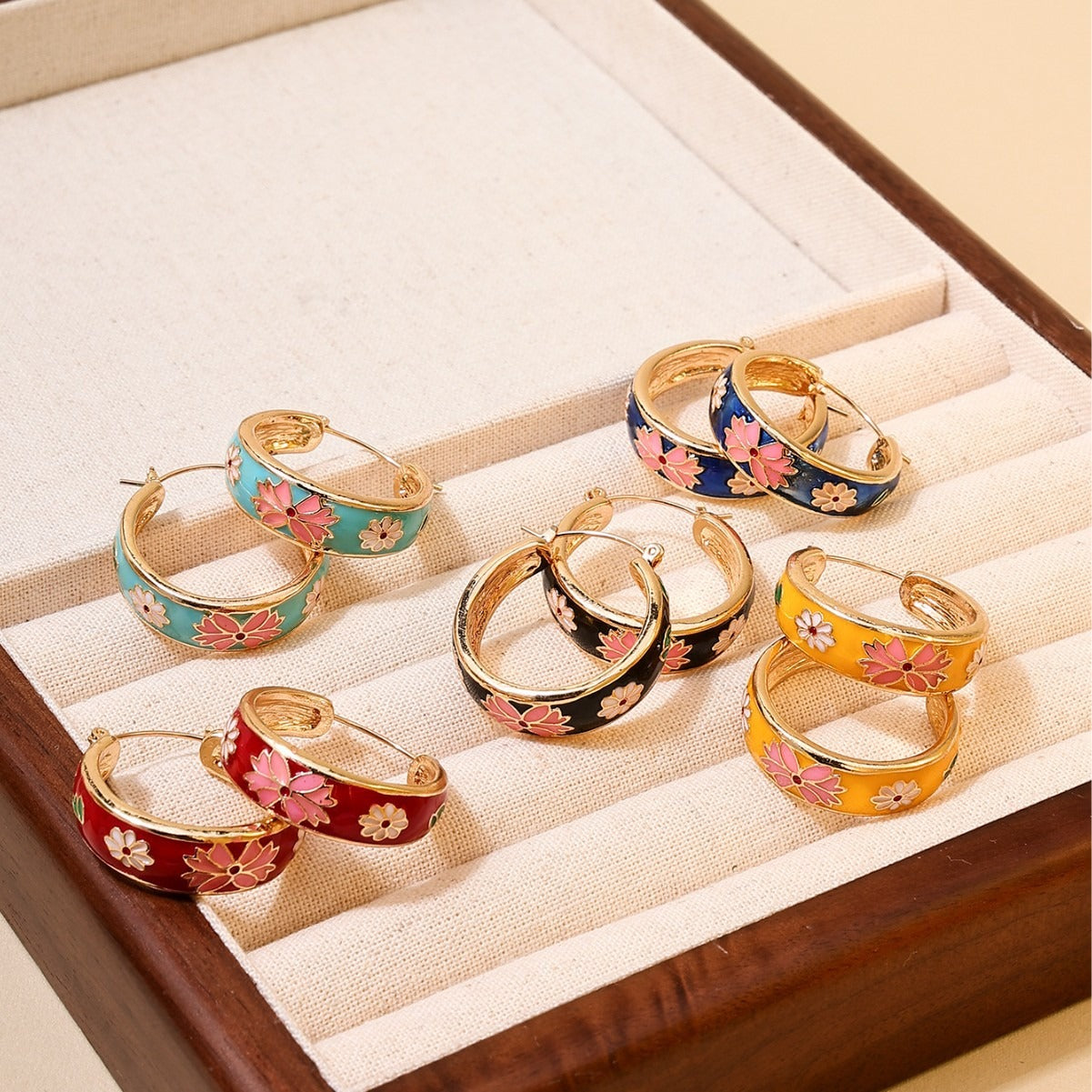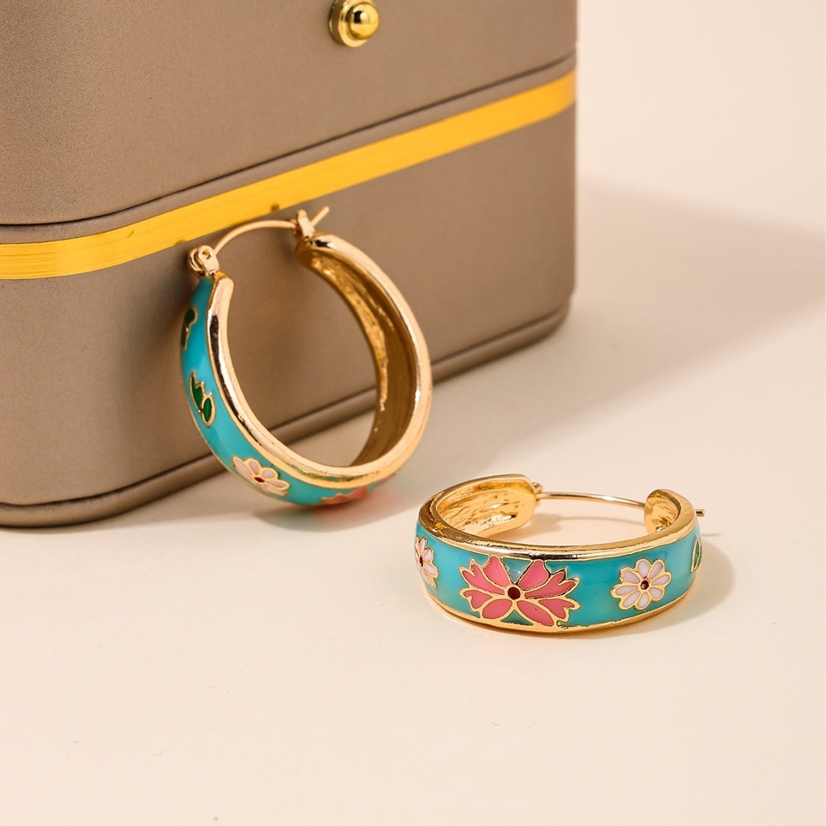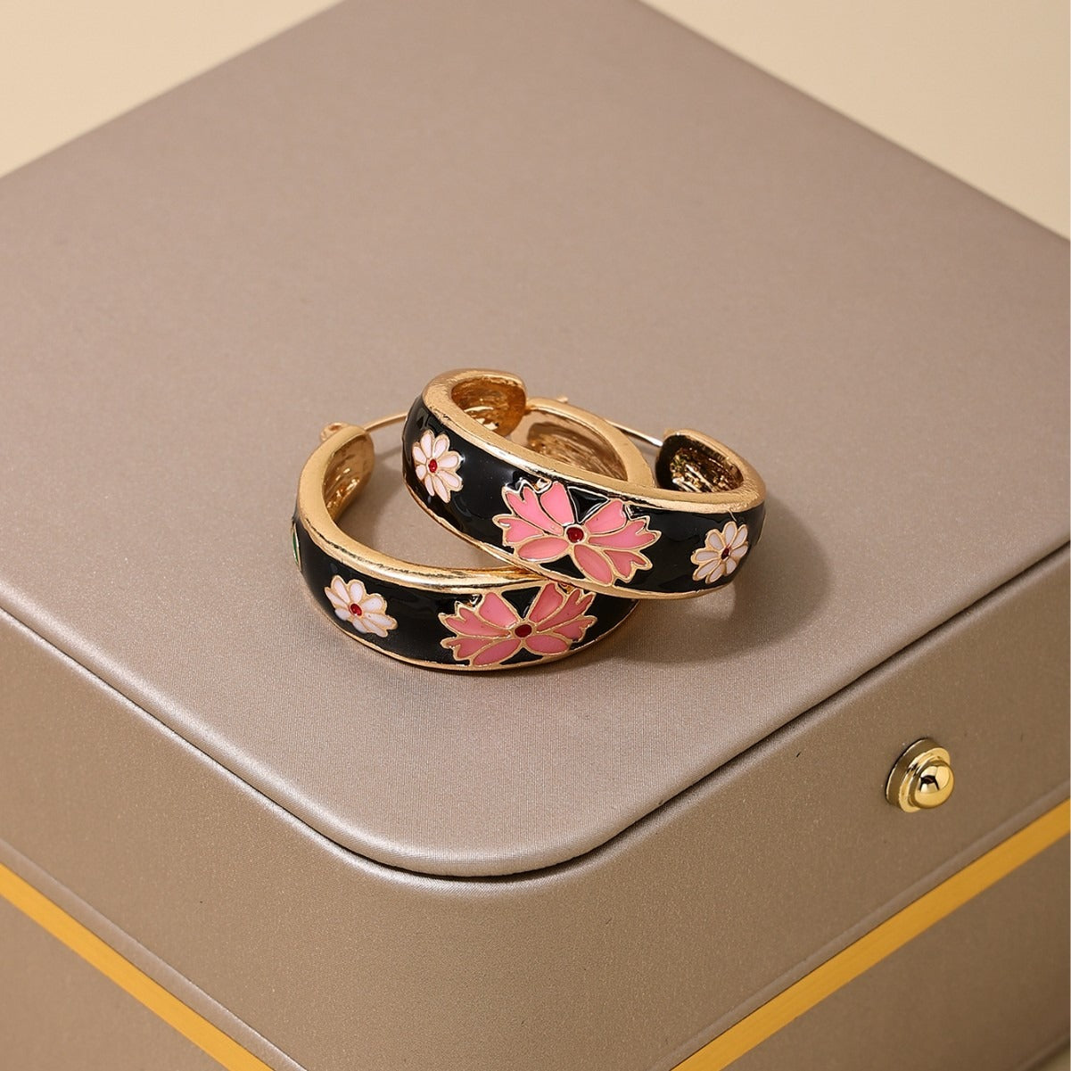 Brighten your look with these Floral Enamel Floral Hoop Earrings, a playful mix of retro charm and modern elegance. Each hoop is decorated with delicate pink flower motifs set against vibrant enamel backgrounds, making them the perfect statement accessory to add color and fun to any outfit.