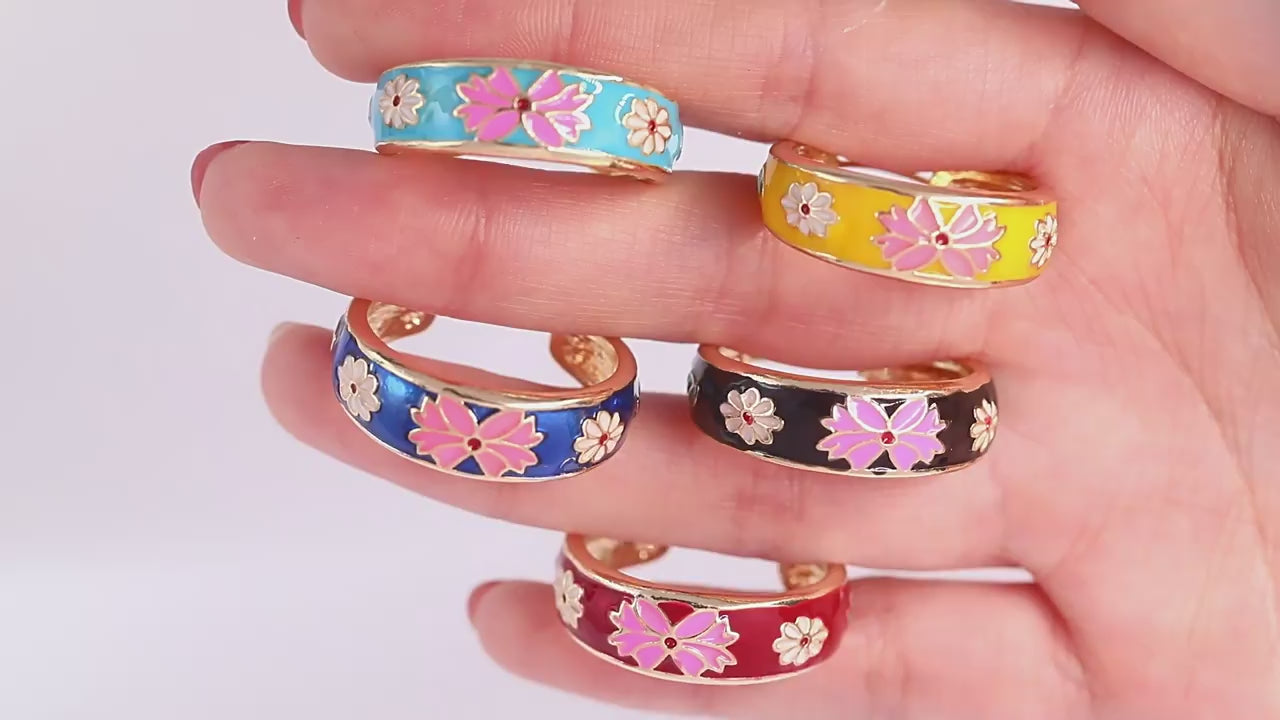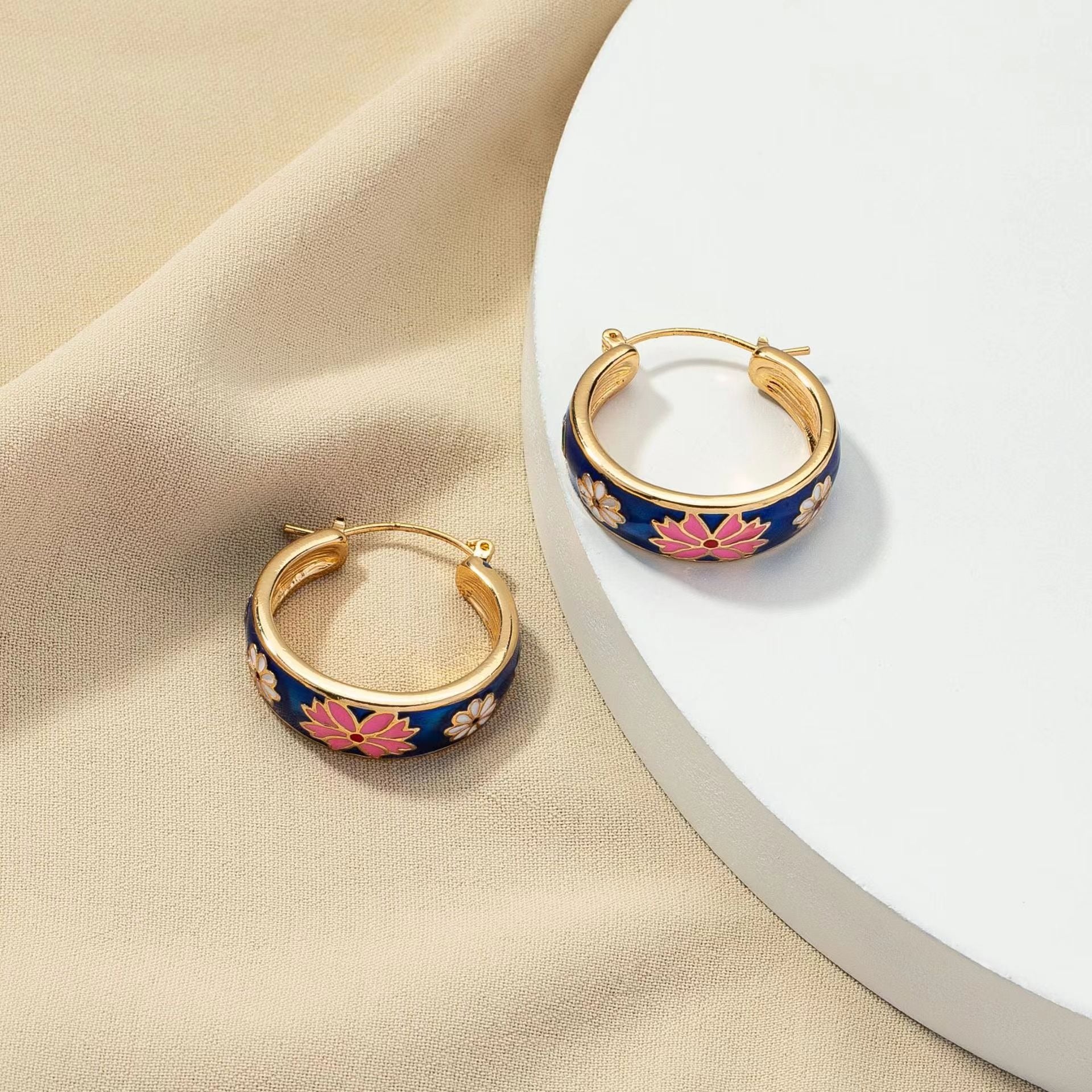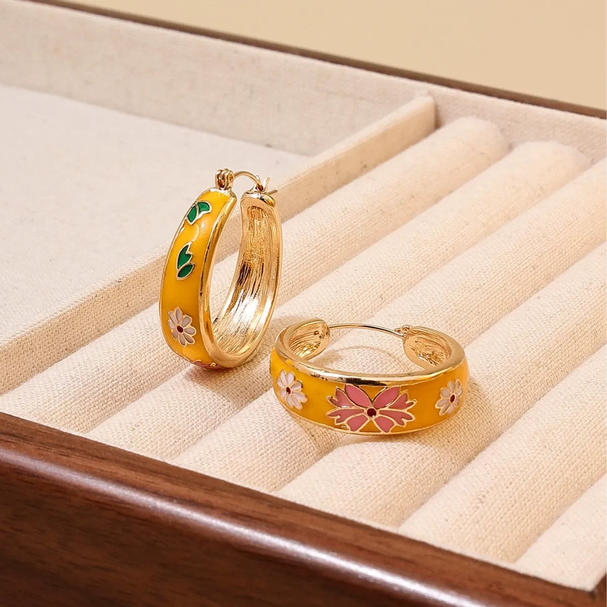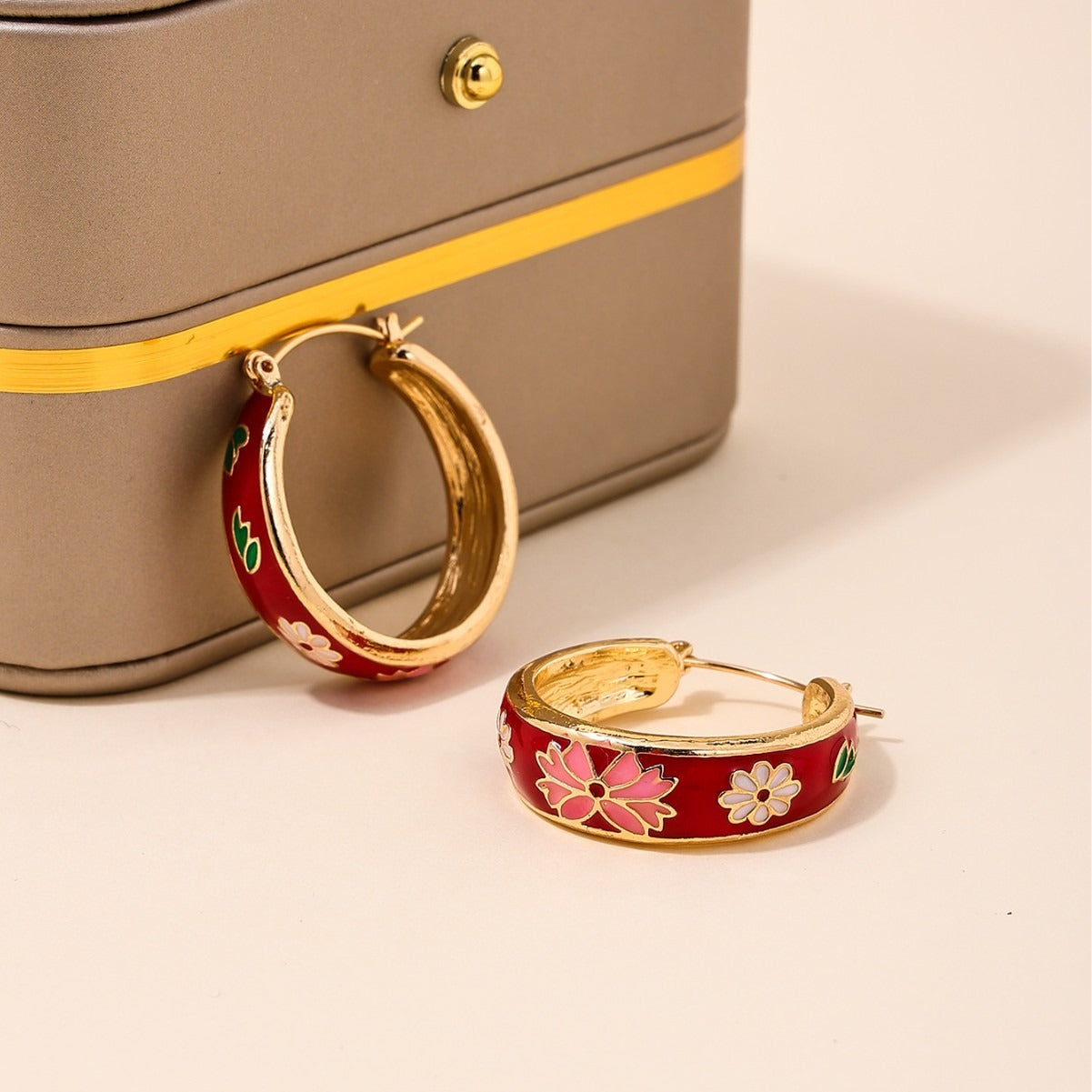 Brighten your look with these Floral Enamel Floral Hoop Earrings, a playful mix of retro charm and modern elegance. Each hoop is decorated with delicate pink flower motifs set against vibrant enamel backgrounds, making them the perfect statement accessory to add color and fun to any outfit.