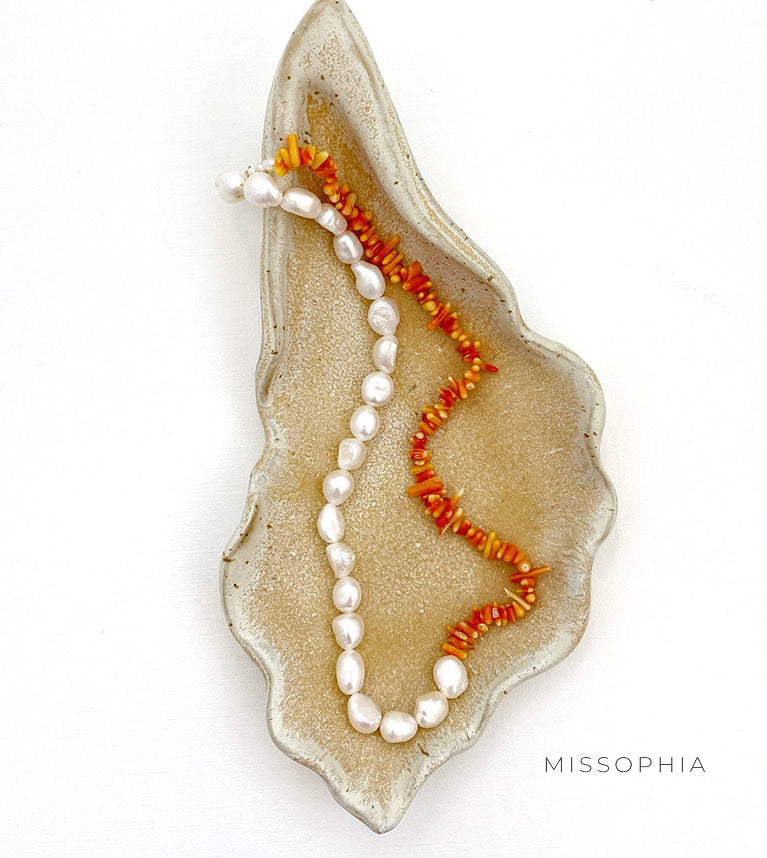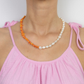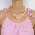A vibrant statement piece that merges natural elegance with playful color. This necklace features lustrous freshwater pearls contrasted with bold irregular orange coral chips, creating a dynamic and summery aesthetic. Perfect for layering or wearing solo, it adds a chic pop of color to any outfit.