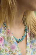 Bring the ocean close with this stunning necklace made of irregular blue coral chips, accented with subtle golden details. The natural textures and vivid blue tones give it a breezy, coastal charm that perfectly complements summer looks or adds a pop of freshness to any outfit.