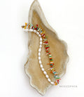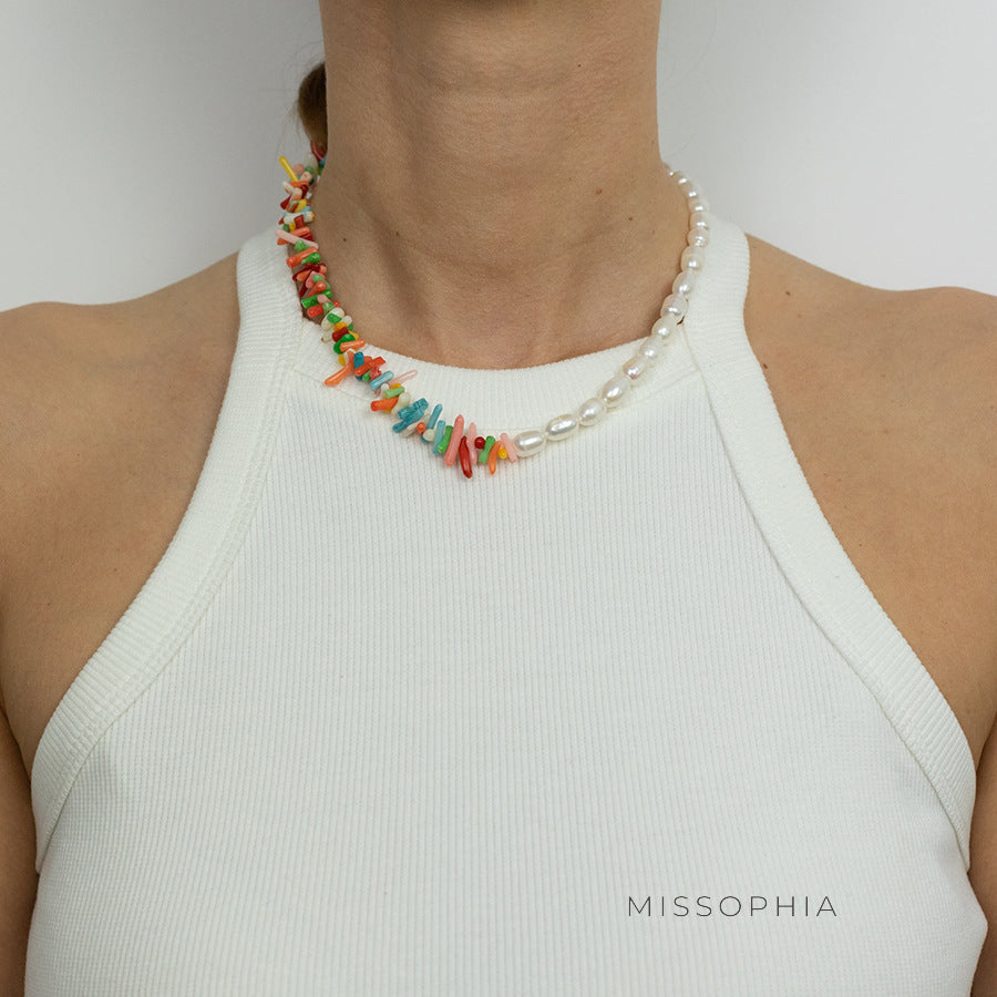 A playful yet elegant design that combines the timeless beauty of freshwater pearls with the vivid colors of irregular gemstones. The contrast between the lustrous pearls and the vibrant beads creates a statement piece that feels both chic and unique — perfect for layering or wearing as a standout accessory. Finished with Titanium Steel vacuum-plated in 18k gold for lasting shine and durability.