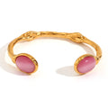Embrace understated elegance with the Khamari Oval Opalite Cuff Bracelet, a refined accessory designed to elevate any ensemble. This exquisite piece features a slender, gold-plated open-cuff design, perfectly complemented by striking oval opalite stones at each end. Available in both a luminous white and a captivating green, it offers a touch of sophisticated charm.