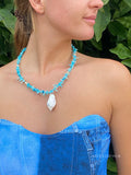 A bold and breezy statement piece, this necklace combines vibrant turquoise chip beads with a natural seashell pendant. Perfect for summer days, beach outings, or layering with other gold and pearl jewelry, it captures the essence of coastal charm and effortless style.
