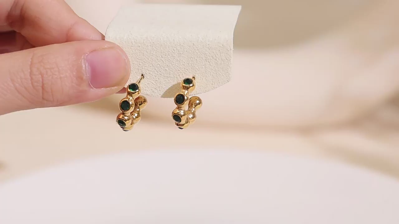 Introducing the "Logan Emerald Zircon Drop Earrings," a stunning pair designed to infuse your look with sophisticated glamour. These elegant, gold-toned earrings feature a captivating emerald-colored central stone, exquisitely framed by delicate clear zircons, embodying a refined French retro aesthetic. The intricate textured finish further enhances their vintage charm, making them a perfect statement piece for any elegant occasion.