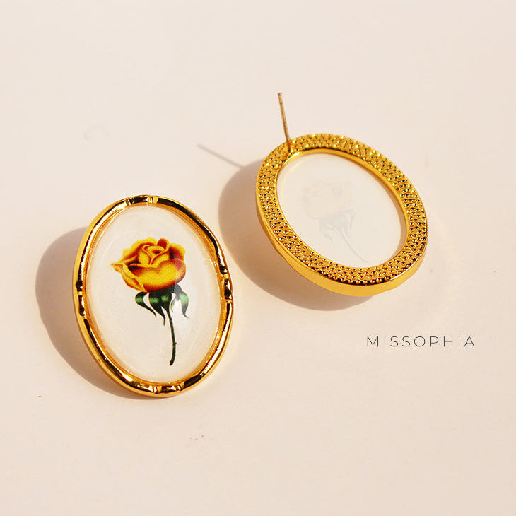 Adorn your look with the exquisite Sonya Yellow Rose Drop Earrings, a statement piece that blends vintage charm with modern allure. These elegant earrings feature a vibrant yellow resin rose nestled within a sleek oval drop, creating a captivating floral design. Perfect for elevating any ensemble, they offer a touch of refined artistry and unique sophistication.