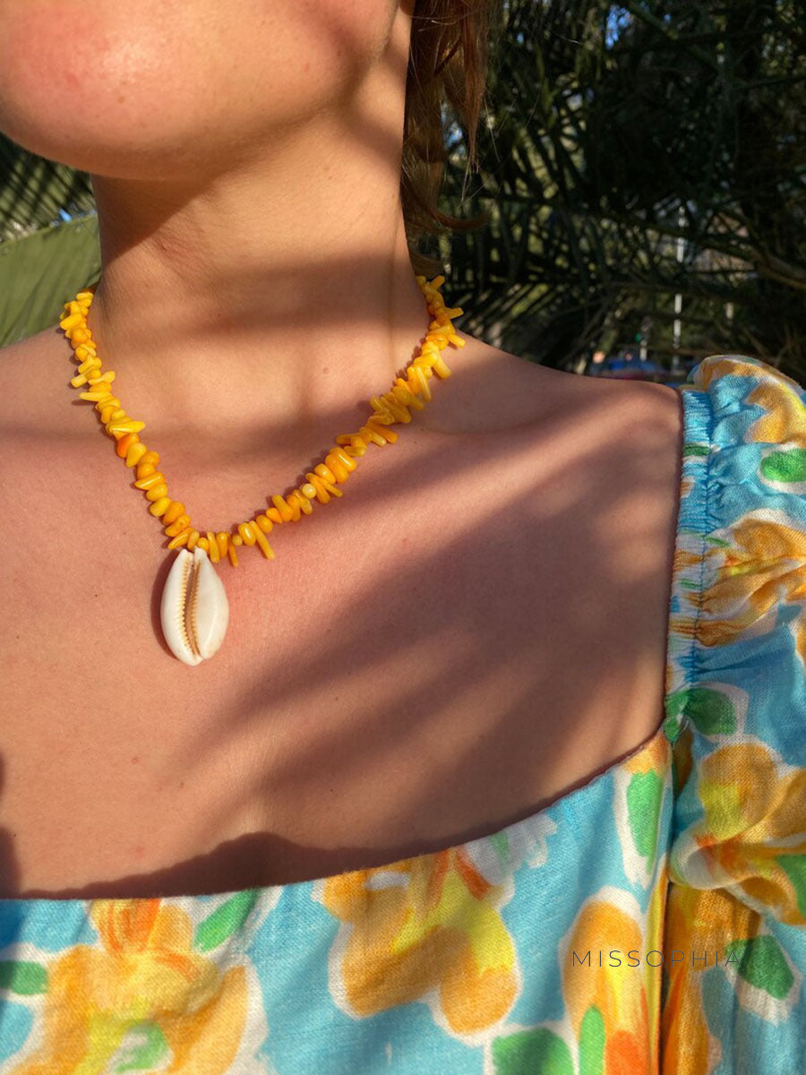 Bring summer energy into your everyday look with this vibrant necklace, crafted with irregular yellow gemstone beads and finished with a natural seashell pendant. The combination of earthy textures and golden hues creates a playful yet stylish piece, perfect for beach days, vacations, or adding a touch of sunshine to any outfit.